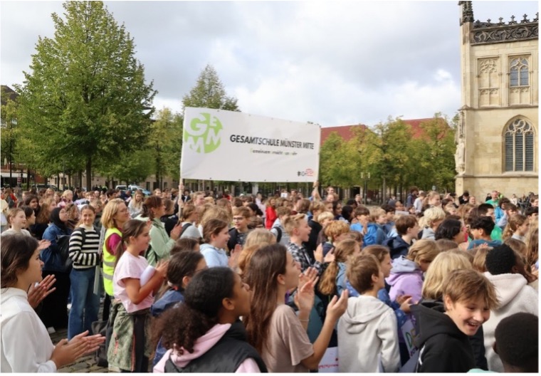 Mit ihren kreativen Botschaften zogen sie anschließend zusammen mit ihren Lehrkräften vom Prinzipalmarkt zum Domplatz – ganz im Sinne des Mottos „Demokratie leben, Demokratie feiern“.
