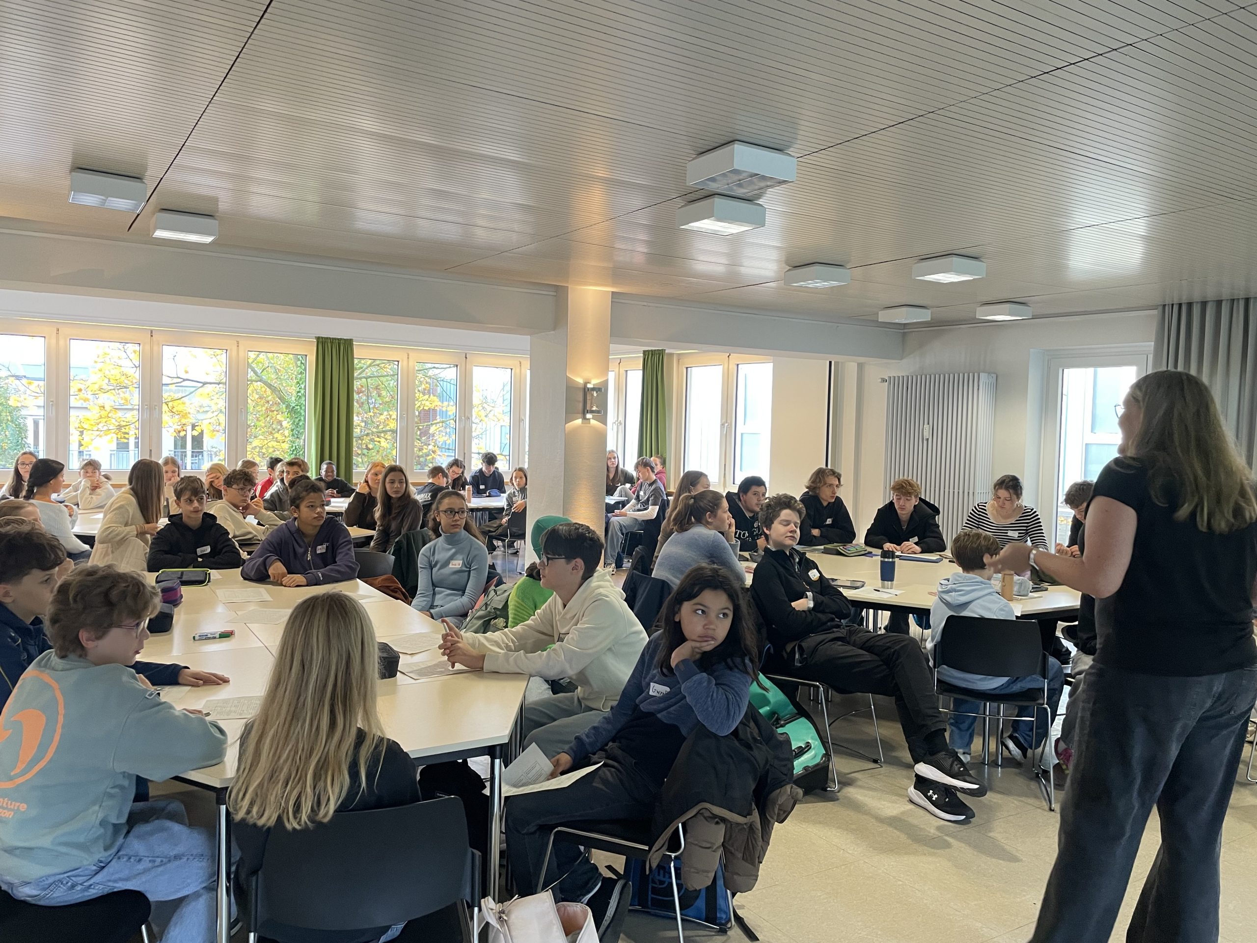 Am 3. November 2025 fand an der Gesamtschule Münster Mitte (GeMM) zum zweiten Mal der große SV-Projekttag statt. Die Klassen- und Schülersprecherinnen starteten gemeinsam mit dem neuen SV-Team engagiert in den Tag. Zunächst wurden in einer kreativen Phase „Schätze gehoben” – die Schüler:innen sammelten ihre Ideen und Vorstellungen für die Arbeit der SV. Anschließend bildeten sich verschiedene Arbeitskreise, in denen die Schüler:innen nun motiviert an konkreten Themen der Schulentwicklung arbeiten werden. Den Abschluss des Tages bildete der Besuch der Grünen-Politikerin Andrea Blome. Gemeinsam mit dem SV-Lehrerinnen-Team hatten die Schüler:innen spannende Fragen vorbereitet – und bekamen die wertvolle Gelegenheit, Antworten aus erster Hand zu erhalten. Wie können Kinder und Jugendliche ihre Ideen und Wünsche in der Schule und in der Kommunalpolitik einbringen? Andrea Blome nahm sich Zeit für die interessierten Schüler:innen und erklärte anschaulich und verständlich die Zusammenhänge rund um die Kommunalpolitik. Mit positiver Stimmung endete der Projekttag – und zugleich markierte er den Startpunkt für die eigentliche Arbeit: echte Teilhabe, gelebte Demokratie und sichtbare Mitgestaltung durch die SV. Demokratiebildung ist an der GeMM eine tragende Säule der Schulentwicklung. Die Schüler:innen erfahren hier unmittelbar, was Mitbestimmung bedeutet und wie sie ihre Schule aktiv prägen können. Der SV-Projekttag hat eindrucksvoll gezeigt, wie lebendig Partizipation sein kann: ein Tag voller Energie, neuer Erkenntnisse und echter Gestaltungsmöglichkeiten.